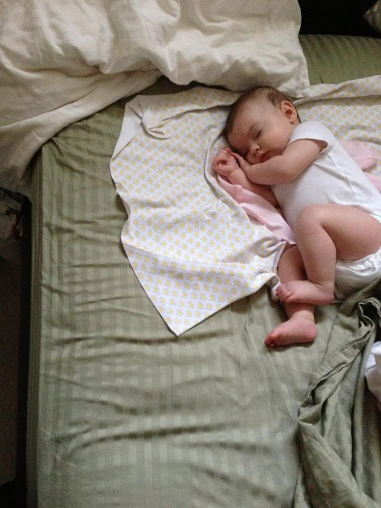 Of course Cora ended up growing too long for the co-sleeper if she extended her legs fully. We continued using it anyway though because she normally sleeps with her feet tucked up. Then just last week it was like experiencing the pack and play all over again. After her nighttime feeding I would put her down in the co-sleeper and she would immediately wake up. Adam and I realized she had definitely outgrown the co-sleeper and was probably uncomfortable. So now, she sleeps on the bed in between us! We're not afraid of crushing her anymore since she's much heartier now than she was at 5 weeks, but I still wake up a lot to make sure she's not under the blanket. Now that she's really sleeping in the bed with us I can appreciate this image: